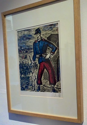 Así es que bajamos una pequeña escalera para dirigirnos a la primera de las muestras. En el corto camino, uno y otro cuadro y algún que otro motivo expuesto, había una pequeña mesa con una mantel rojo, tal como se ve en la fotografía, y encima de ella un cuaderno con una birome para que uno deje su comentario de la visita. En la otra sala, del otro sector del museo, había otra más.